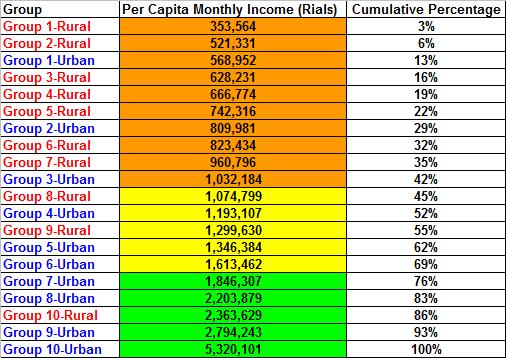 اخیراً رئیس مرکز آمار اعلام کرده که: دولت تصمیم گرفته است جامعه را بر مبنای درآمد خانواده ها به سه خوشه تقسیم کند. دهکهای اول تا چهارم (حدود سی میلیون نفر) در خوشۀ اول، دهکهای سوم تا هفتم (در حدود 18 میلیون) در خوشۀ دوم و سه دهک بالا (با جمعیت 14 میلیون) در خوشۀ سوم قرار دارند. دو خوشۀ اول یارانۀ مستقیم می گیرند. ( در بعضی از سایتها آمده است که قانون ذکر می کند که یارانه ها باید بین همۀ افراد کشور، و نه فقط 48 میلیون نفر، تقسیم شود. من این برداشت را ندارم. عبارت «کلیۀ خانوارهای کشور» با کلمۀ «نسبت» به عبارت «درآمد خانوار» مرتبط است. منظور از آن «درآمد هر خانوار نسبت به درآمد خانوارهای دیگر» است.) [حاشیه: ما هر چی حساب و کتاب فرمودیم، نتوانستیم این ارقام را با مفهوم دهک درآمدی و با عنایت به ابعاد خانوارها جور بفرماییم. هر که فرمود، بفرماید، ما هم مستفیض شویم.]
