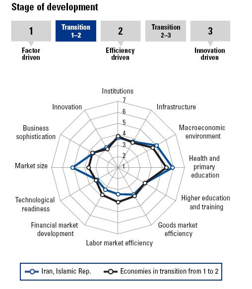 ایران در این طبقه بندی در حال انتقال از گروه اول، اقتصاد مبتنی بر منابع، به گروه دوم، اقتصاد مبتنی بر کارآیی، است. احتمالاً علت این امر مبتنی بودن اقتصاد ایران بر نفت است. اکثر کشورهای نفتی در این گروه قرار گرفته اند.