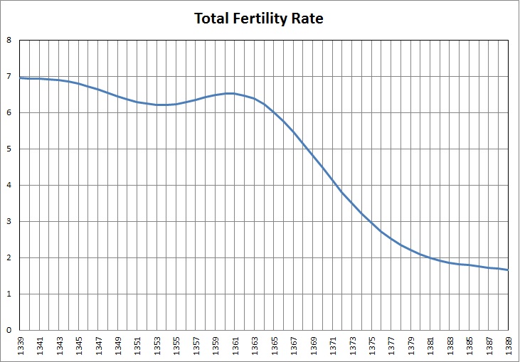 به نظرم برای داشتن دیدی بهتر، بهتره نمودار fertility rate رو با نرخ مرگ و میر کودکان زیر پنج سال روی هم رسم کنیم. درسته بعد خانوار رو به کاهش بوده و بیشتر به سمت کیفیت تا کمیت رفتیم ولی برای همین موضوع هم باهاس از اختلاف بین نرخ زاد و ولد و مرگ و میر زیر 5 سال استفاده کرد تا نتیجه کم تورش تری بگیریم.