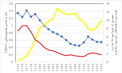 پس نوشت: نمودار زیر نسبت قیمت دلار به شاخص عمومی قیمت، تبدیل شده به واحد برای سال 1381 که نرخ ارز یکسان شد، همراه با سهم هزینۀ موز در کل هزینۀ میوه برای خانوارهای شهری، و نیز نسبت قیمت موز به متوسط قیمت میوه‌هایی که بیشترین مقدار مصرف را در سبد خانوار دارند (سیب، پرتقال و نارنگی و لیمو شیرین، و هندوانه و خربزه) را نشان می‌دهد. نمودار را تا سال 1394 کشیدم چون آمار بودجۀ خانوار را تا این سال دارم.
